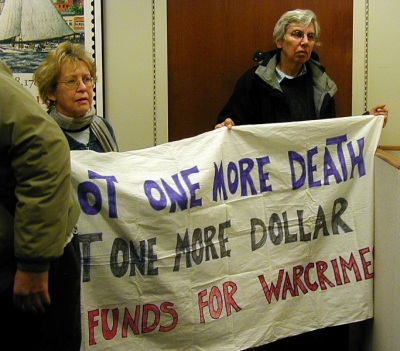 Mary Parker of Mt. Rainier and Susan Crane of Baltimore hold a sign in Sen. Mikulski's office protesting additional funds for the war in Iraq. Photos by Hallie C. Falquet.