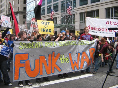Elsewhere, a multi-group coalition of students led a raucous anti-war party called "Funk the War," through the streets of downtown Washington, blasting music and dancing their hearts out in the middle of the city, accompanied by the polar-bear duo.