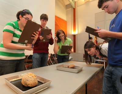 Students from St. Marys County high schools identify parts of the human brain using a real human brain during the Fourth Annual Southern Maryland Brain Bee held at St. Mary's College of Maryland. From left to right: Torrey Ferguson, from Leonardtown High School; Trey Bergen, from Leonardtown High School; Megan DeGruy, from Chopticon High School; third-place winner Claire Weber, from Great Mills High School; and Thomas Rudowsky, from Great Mills High School. (Photo: James Parcell)