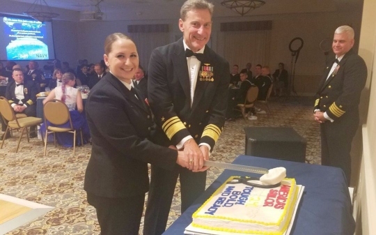 Vice Adm. Paul Grosklags, commander, NAVAIR, and Seaman Emilley Taback topped off the night at the NAS Pax River 241st Navy Birthday Ball with the traditional birthday cake cutting. (U.S. Navy photo by Marcia Hart)PATUXENT RIVER, Md. (Oct. 22, 2016)—Members of the Naval Air Station Patuxent River community donned their best to celebrate at the Navy 241st Birthday Ball Oct. 13 at the River's Edge Catering and Conference Center.