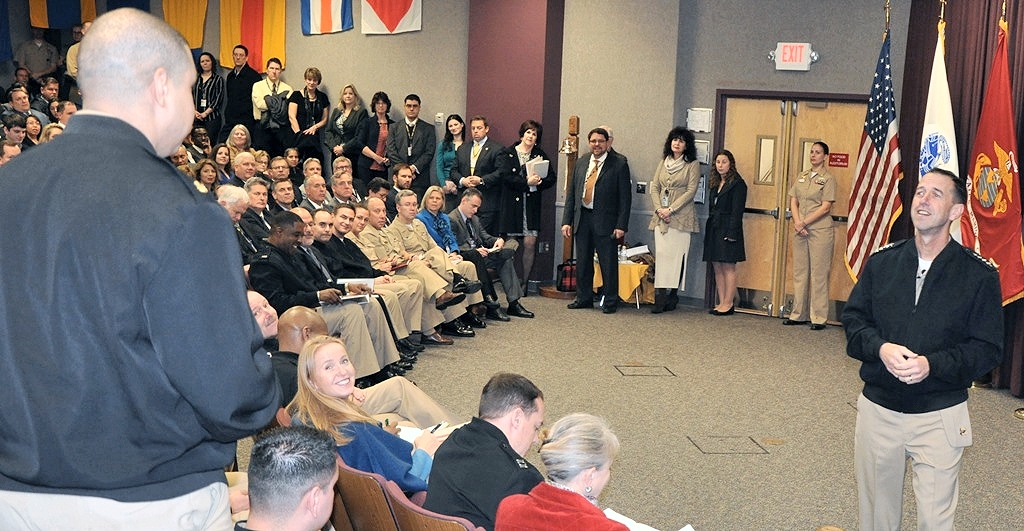 Upon arrival, the CNO spoke to more than 900 Sailors, government civilians, and defense contractors attending his early morning all-hands call in person or over live stream video.