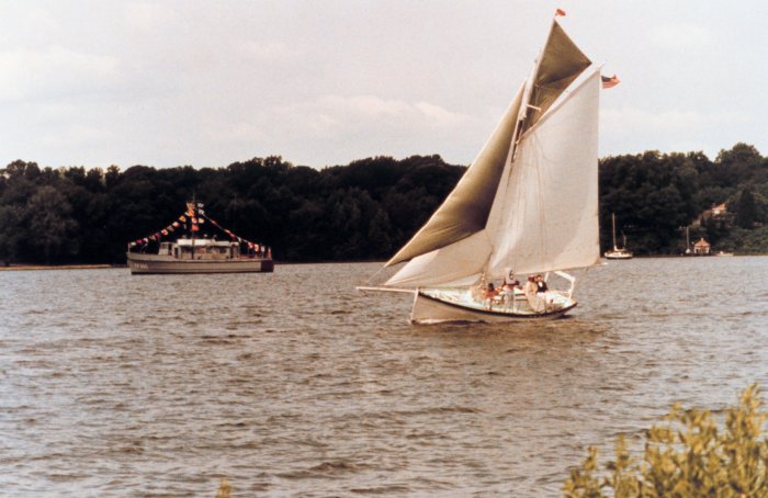 A Navy YP dressed for a holiday while the GALATEA, an old gaff-rigged cutter, travels the waters of the St. Mary's River. Location: St. Mary's City, Maryland; Photo Date: 1984 Summer; Photographer: Mary Hollinger, NODC biologist, NOAA.